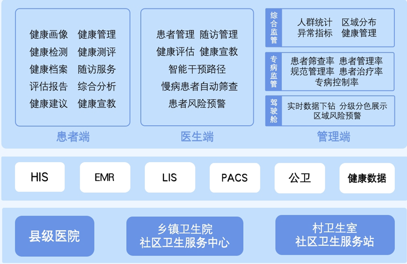 近幾年,和仁科技一直專注于數字化慢病健康管理的實踐與應用,以中國防治慢性病中長期規劃為基礎,集合健康管理和疾病管理核心技術和成熟經驗,研發和建設區域慢病管理數字化平臺。對區域慢病風險人群實時篩查和預警,進行分級分層管理;通過綜合利用醫療數據、健康檔案、居家檢測數據等促進醫防融合;通過采取不同的干預和評估適宜技術,形成可持續的慢性病綜合防治模式。同時,基于知識庫和規則庫、以及慢病健康管理路徑,對不同人群進行路徑化、個性化管理,推進慢性病防、治、管整體融合發展。