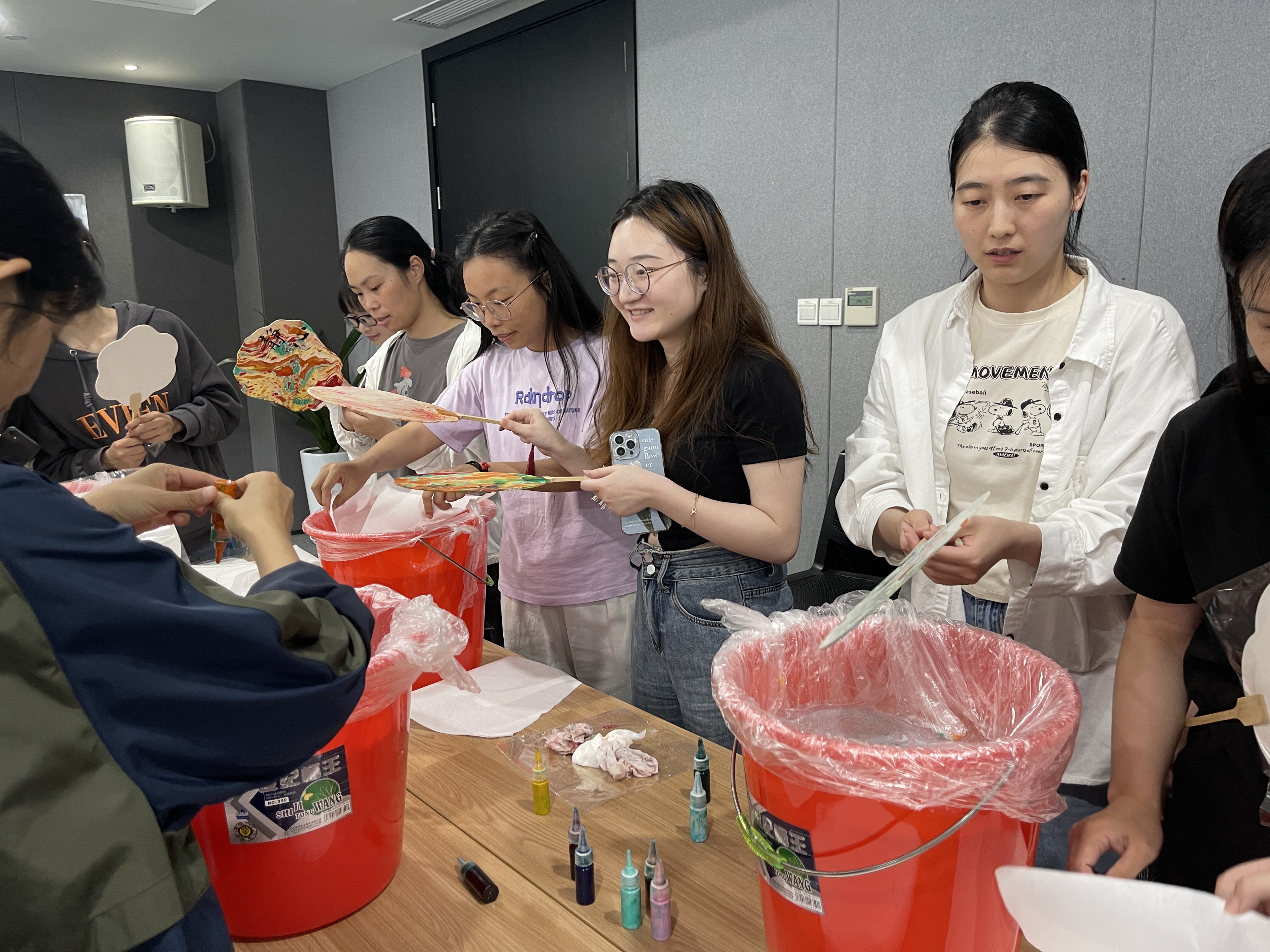 最受大家歡迎的要數非遺手工制作-漆扇。首先根據個人喜好將各色的顏料滴入到一個干凈的水桶中,隨后取出一把空白的扇子,將扇子自由旋轉慢慢沉入水中,讓之前的顏料均勻的撲在扇面上,緩緩將扇子取出,很快一把色彩獨特的漆扇就出現在大家眼前。因為每個人選擇的顏料和扇子下水后旋轉方向的不同,所以每個人制作的扇子都是獨一無二的。