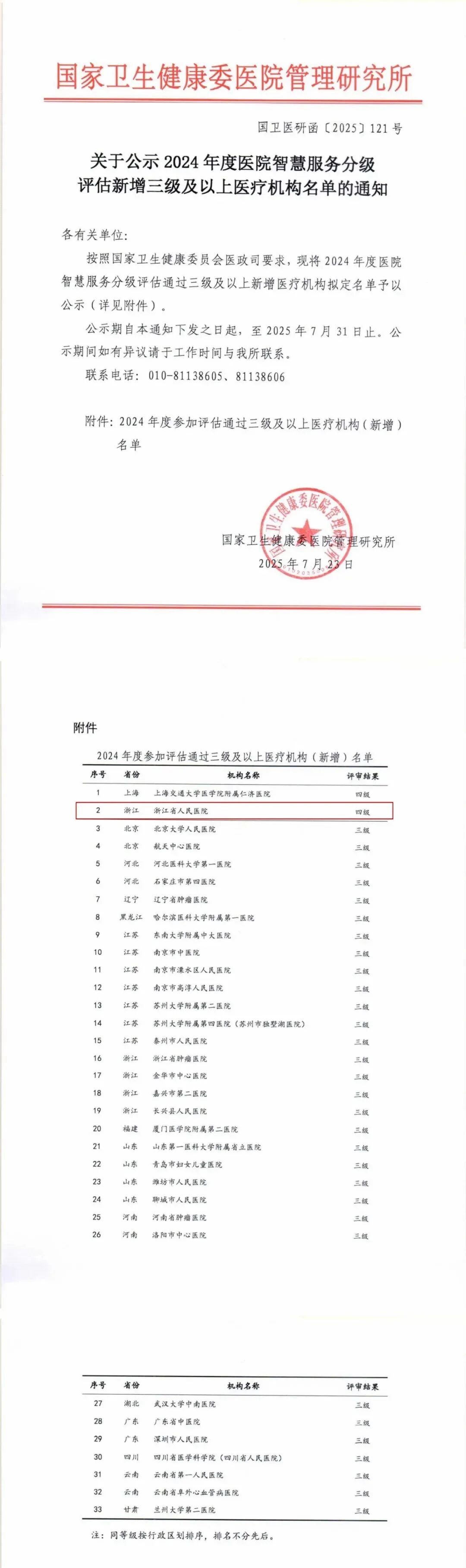 近日,國家衛生健康委醫院管理研究所公布了《2024 年度醫院智慧服務分級評估新增三級及以上醫療機構名單》,浙江省人民醫院憑借卓越的智慧服務建設成果榮耀上榜,獲評四級!值得關注的是,本年度全國僅兩家醫院獲此認定。在此,我們表示熱烈祝賀!