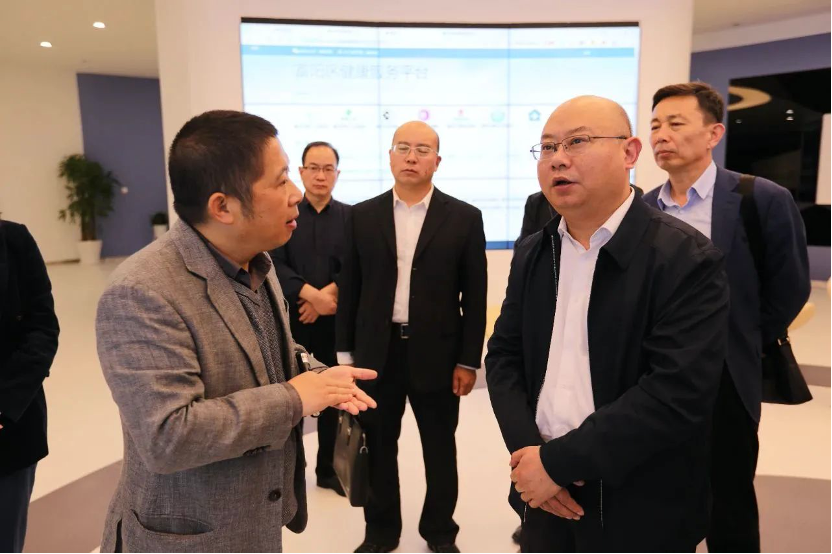 在楊一兵的陪同下,張保華一行參觀了和仁科技展廳,了解了公司的產品技術實力和業務運行概況,認真聽取了和仁科技在智慧醫院和健康城市業務方面的發展情況。